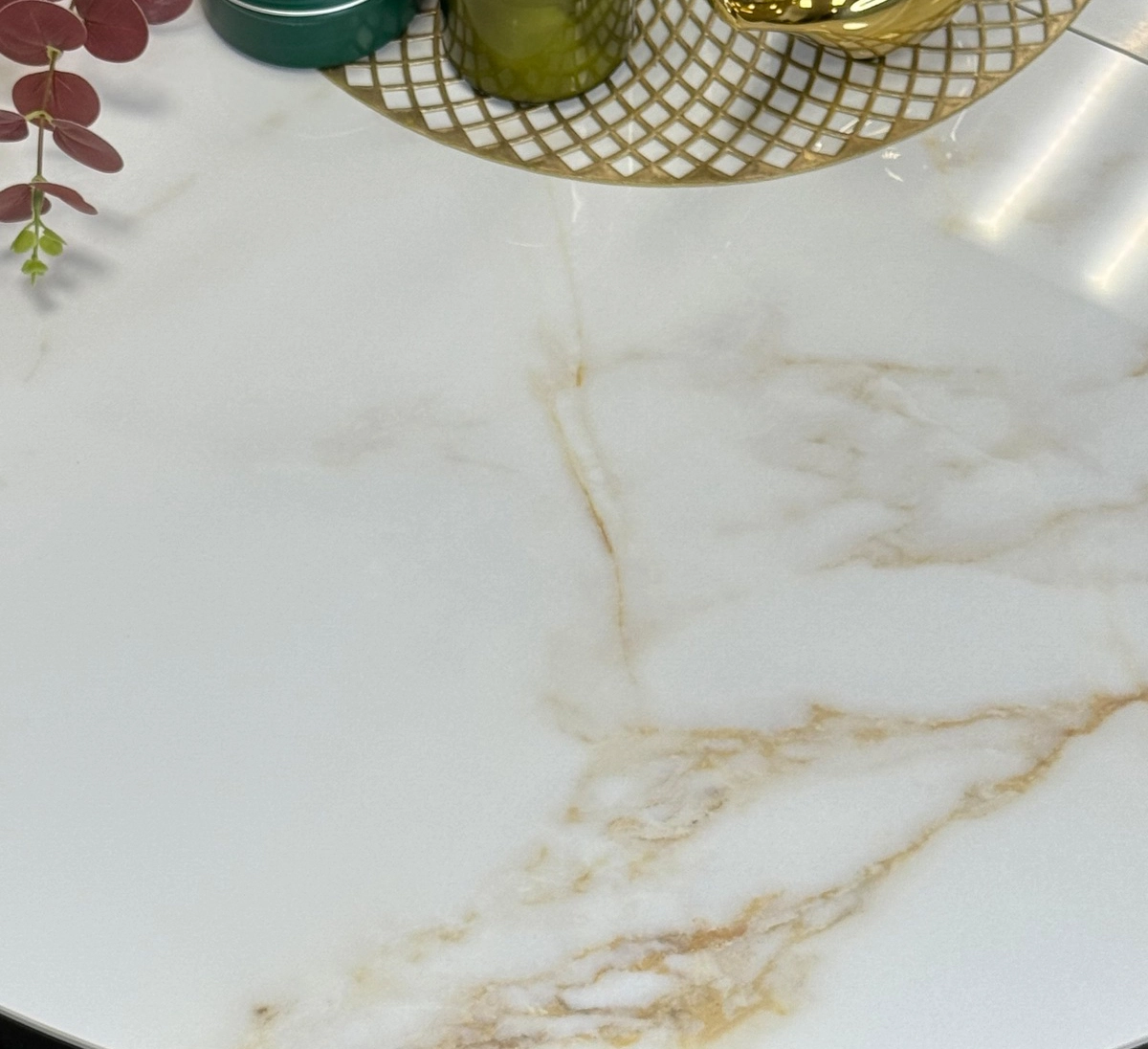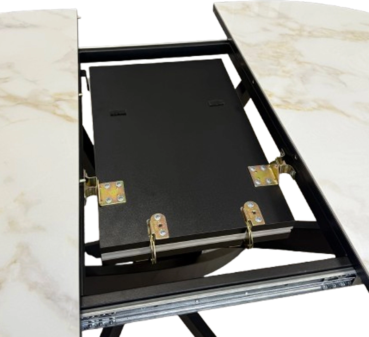 Обеденный стол R1100s – элегантная модель российского производства с овальной столешницей из керамики под белый мрамор. Оснащен удобным раскладным механизмом «бабочка», увеличивающим поверхность с 110х90 см до 140х90 см. Черные металлические ножки с регулируемыми винтами обеспечивают устойчивость. Стол влагостойкий, устойчив к царапинам и высоким температурам – идеально подходит для кухни или гостиной.