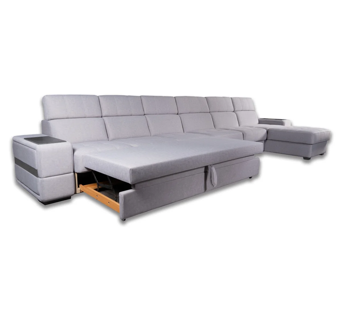 Модули можно менять местами, регулируемые подголовники (6 позиций), ламинированная ниша для белья, обивка без "пальчикового" эффекта, легко чистится, деревянные подлокотники