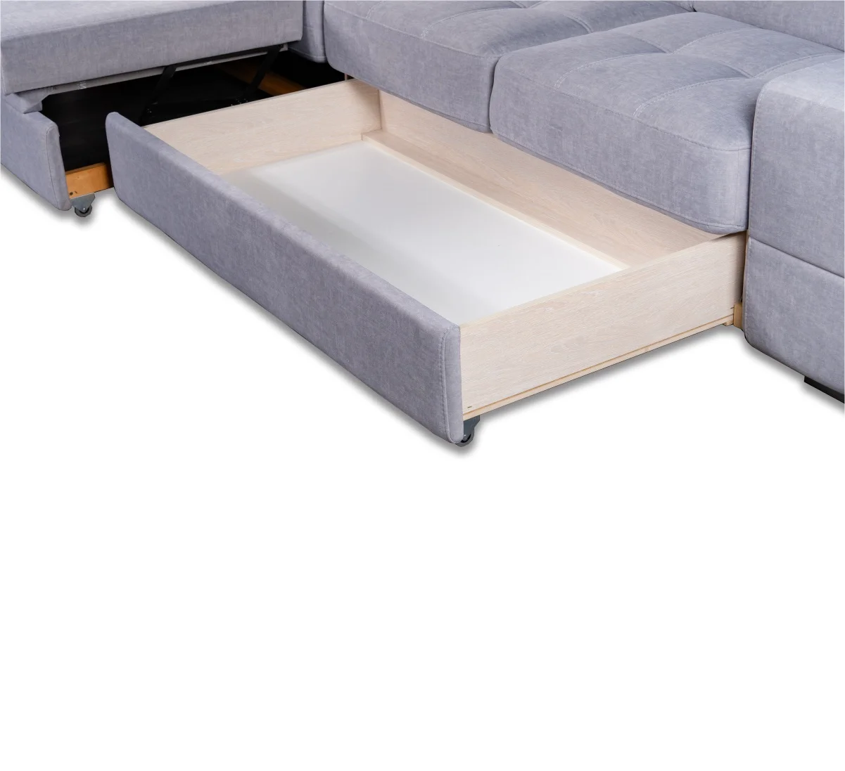 Модули можно менять местами, регулируемые подголовники (6 позиций), ламинированная ниша для белья, обивка без "пальчикового" эффекта, легко чистится, деревянные подлокотники