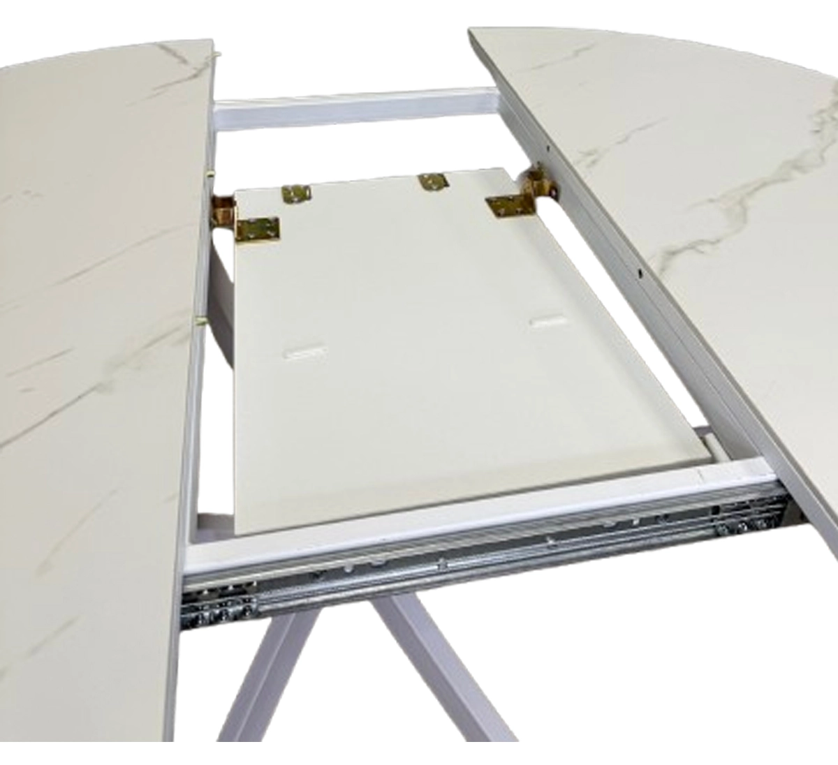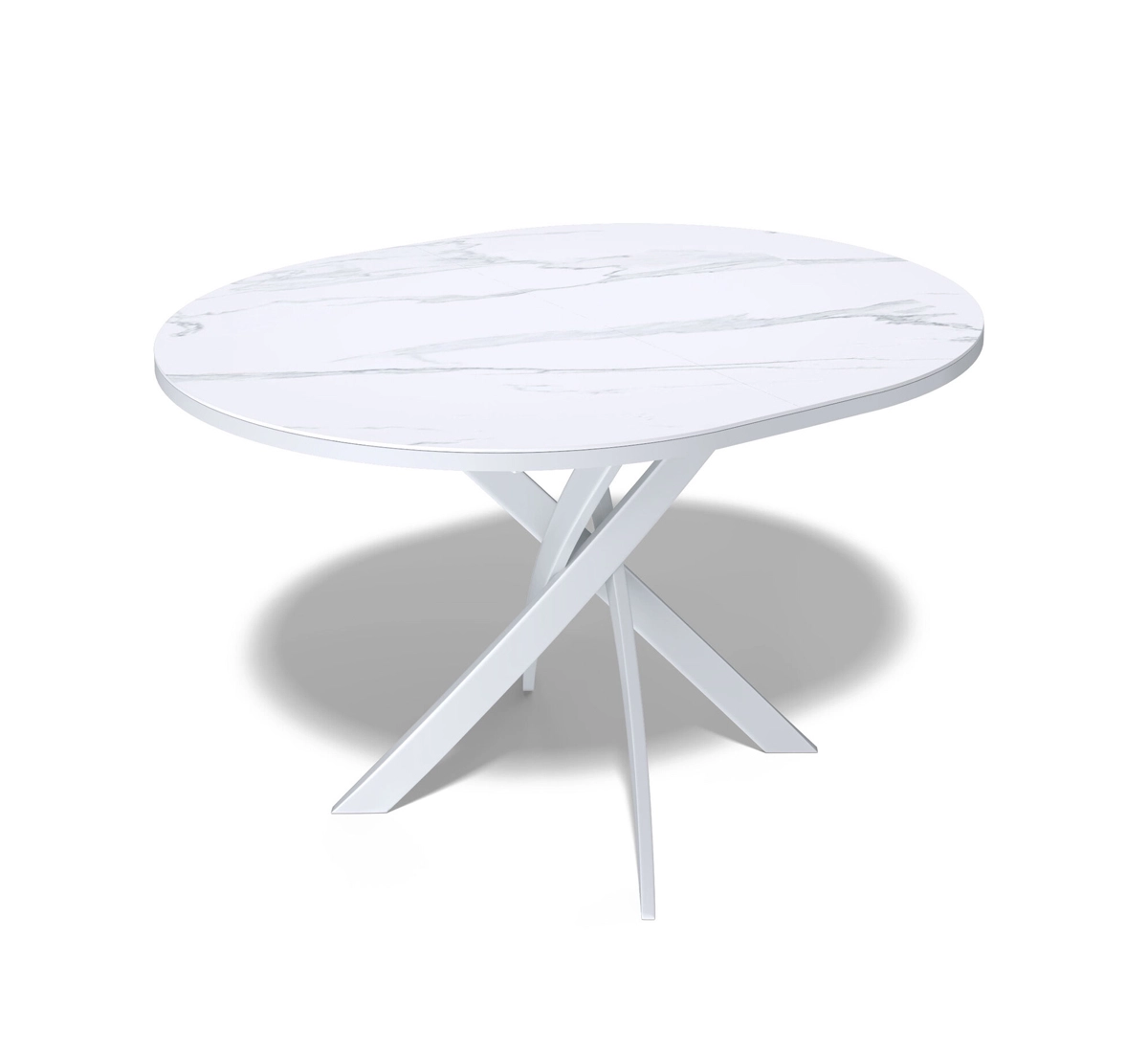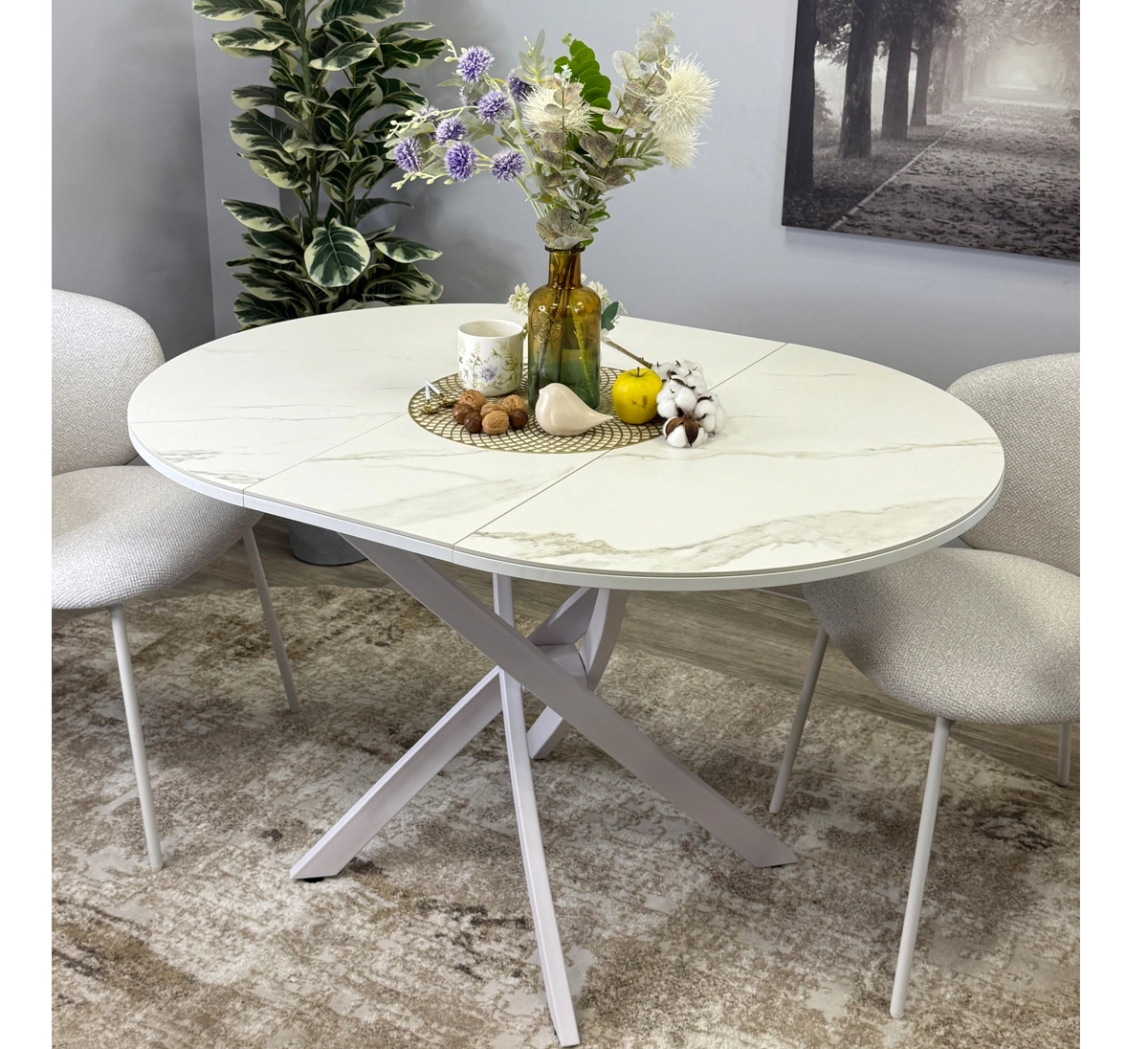Керамическая столешница в оттенке белый мрамор устойчива к царапинам, влаге и высоким температурам, что гарантирует долговечность. Изогнутые белые металлические опоры придают столу легкость и надежность.