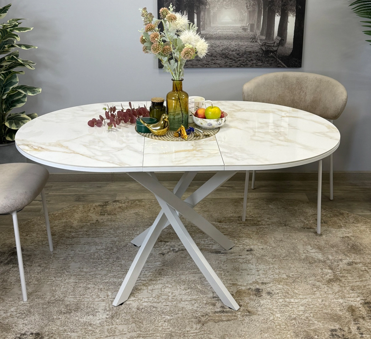 Обеденный стол R1100s – стиль и практичность в одном решении. Керамическая столешница под белый мрамор устойчива к царапинам, влаге и высоким температурам. Удобный механизм раскладки «бабочка» за секунды увеличит поверхность до 140 см, чтобы с комфортом разместить гостей. Белые изогнутые ножки с регулировкой придают легкость и надежность конструкции. Идеальный выбор для кухни и гостиной, где ценят красоту и функциональность.